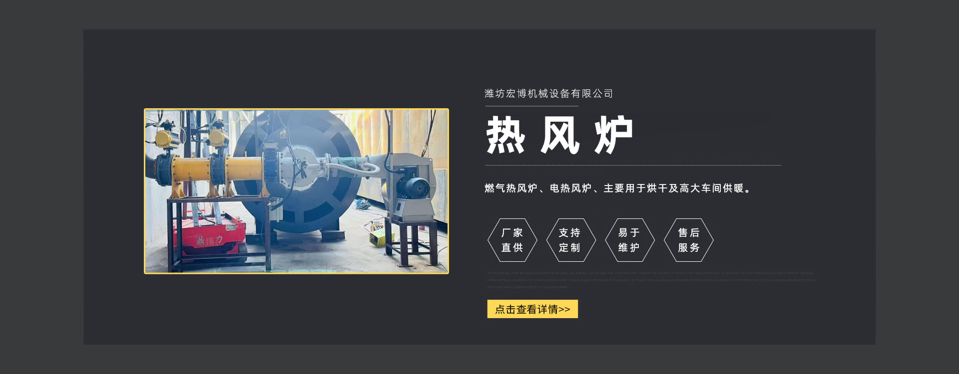 濰坊宏博機械設備有限公司是從事熱風爐、烘干設備、供暖設備的研發(fā)、設計、制造和服務于一體的實體企業(yè)。長期以來,企業(yè)以市場的發(fā)展和客戶的需求為導向,集多年的生產(chǎn)技術與經(jīng)驗為一體,不斷開發(fā)和優(yōu)良產(chǎn)品。